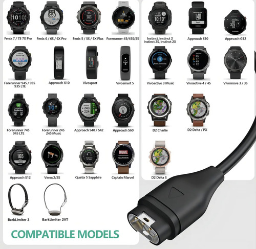 Prepárate para una carga rápida y eficiente con nuestro cargador USB diseñado específicamente para dispositivos Garmin. Compatible con una amplia gama de modelos, desde los populares Garmin Fenix hasta los elegantes Vivoactive y Venu, este cargador es tu compañero ideal para mantener tu dispositivo siempre listo y funcionando.