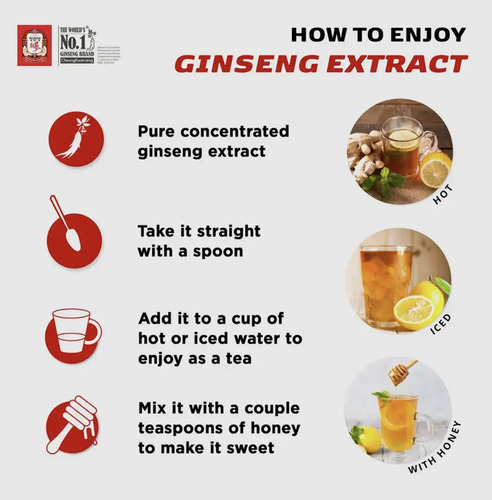 · EL EXTRACTO CONCENTRADO DE GINSENG REAL: No todas las formas de ginseng son iguales. Ganador de los premios Nutra 2021 al mejor ingrediente botánico, el extracto 100 % de ginseng de CheongKwanJang es una mezcla sabrosa y saludable hecha de extracto de raíz de ginseng rojo coreano de seis años de antigüedad. La raíz de ginseng ayuda a combatir el estrés, el sistema inmunológico, apoya la función antioxidante y aumenta la energía. Esta es la mejor inversión en costo total por ginseng y la manera perfecta de fomentar su bienestar.